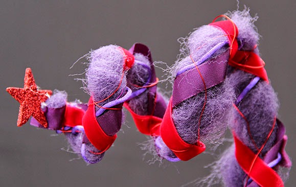 Benodigdheden: * grote kegel en Wooly div .kleuren - *Lint of vilttouw en aluminiumdraad – schaal - kerstballen en kerstversiering